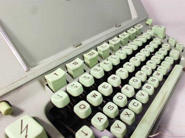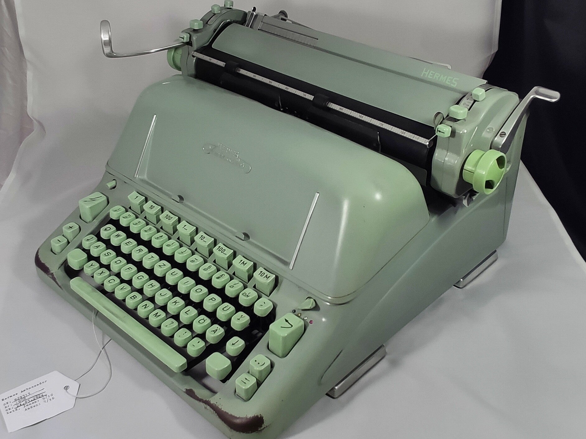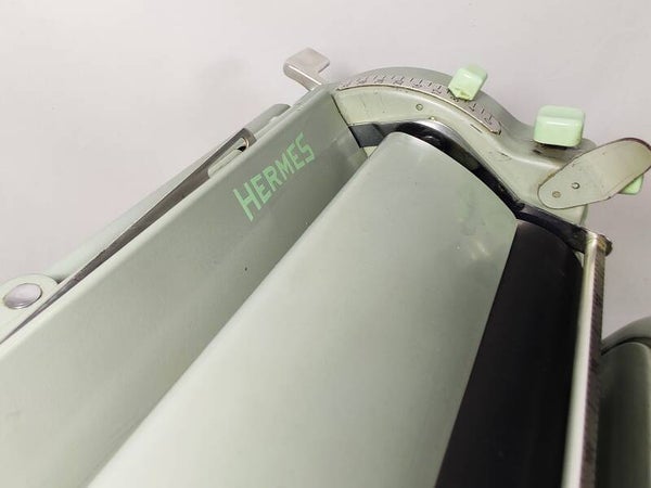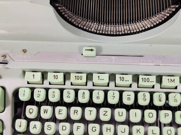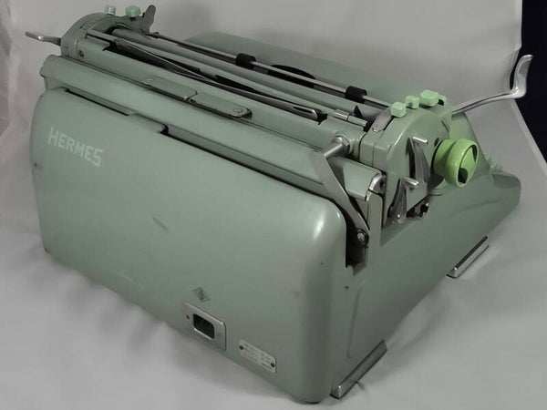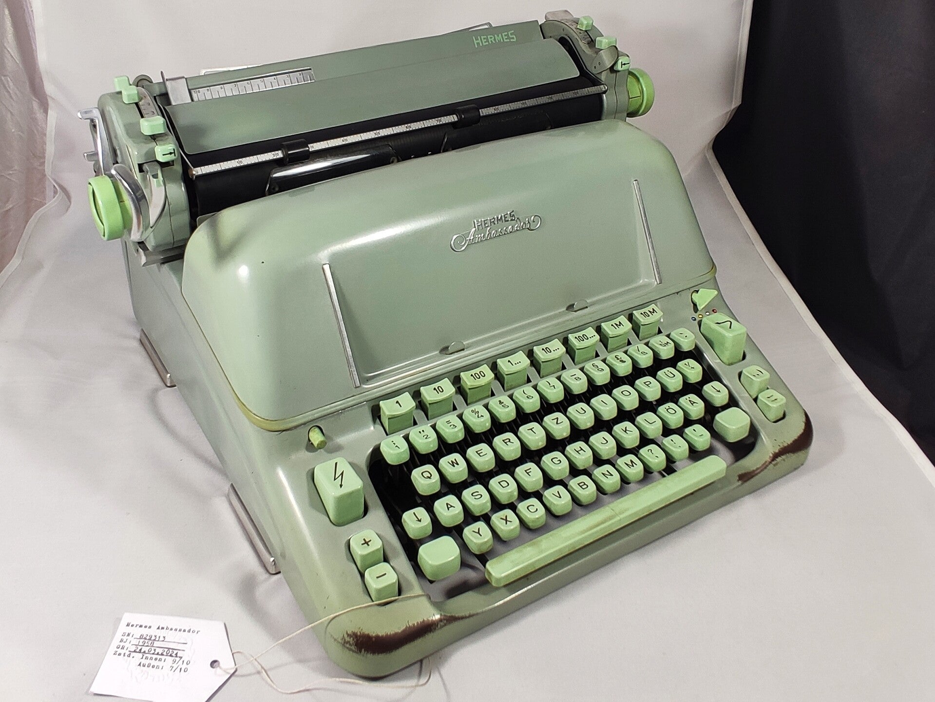 Zum Verkauf steht hier eine seltene und gut erhaltene Hermes Ambassador in der leichten elektromechanischen Variante. Das heißt, die Maschine kann ganz normal wie eine mechanische Schreibmaschine genutzt werden, aber bei Bedarf kann ein Kabel an die Rückseite angeschlossen werden, wodurch ein elektrischer Zeilenschalter genutzt werden kann.