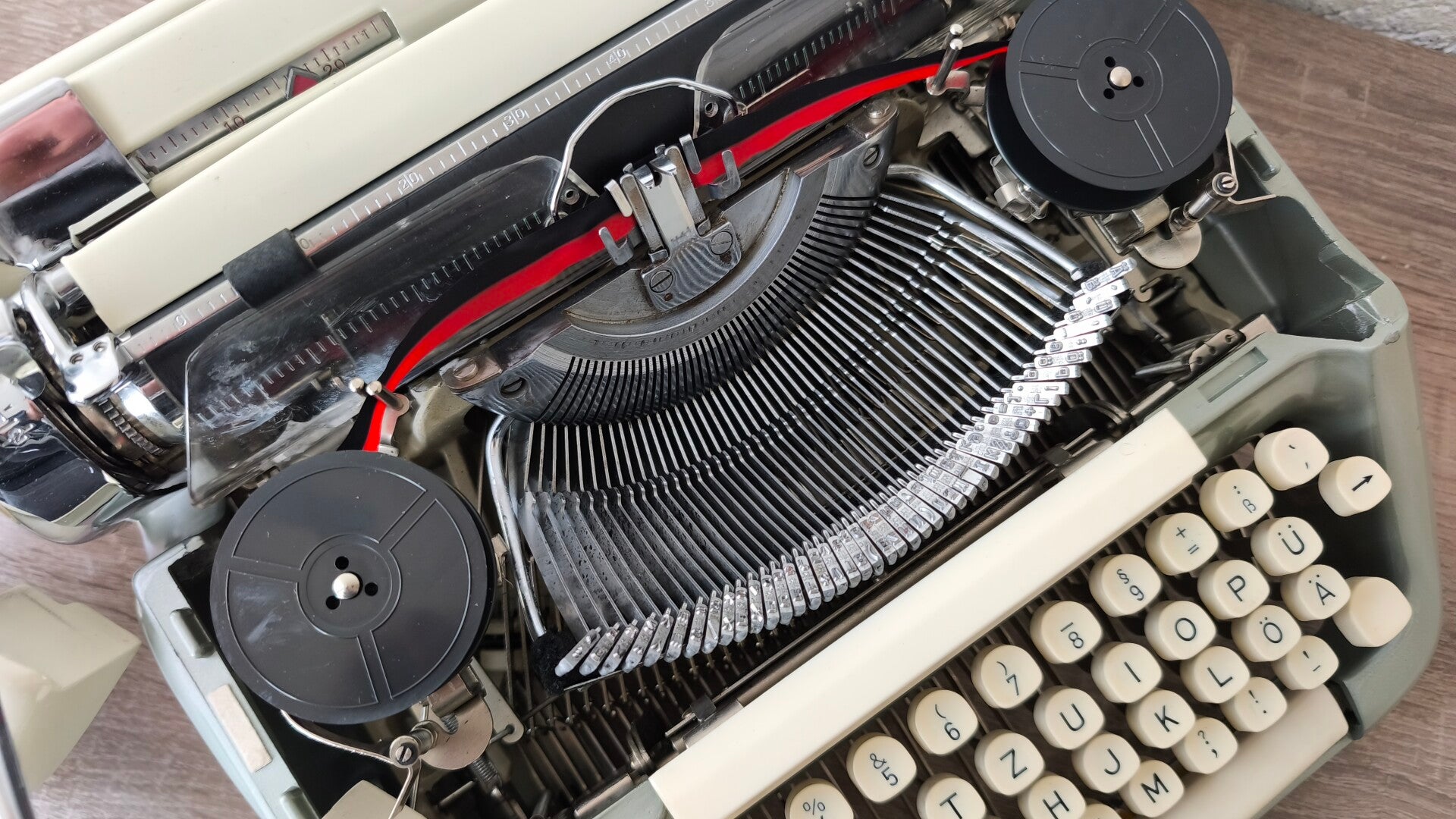 Diese Voss wurde komplett gereinigt und schreibt sich einwandfrei. Das Schriftbild ist klar, der Anschlag angenehm und die Lautstärke sehr moderat. Die Leertaste war leider mal gebrochen und wurde geklebt, aber ansonsten befindet sich die Voss sowohl optisch als auch mechnaisch in einem guten Zustand.